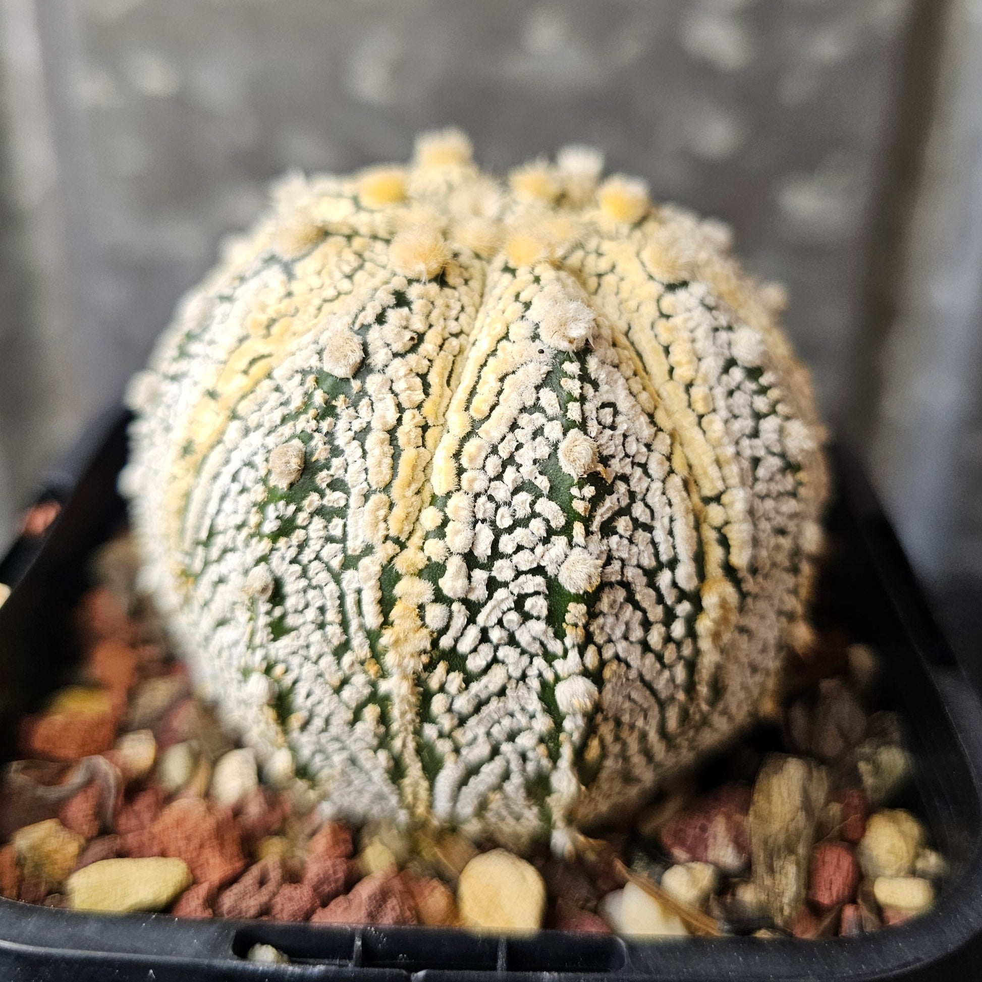 Astrophytum asterias (Honey Glow) features dense flocking washed in a warm honey-yellow tone. A superb specimen with clean symmetry and luminous presence that will elevate and illuminate any serious collection.