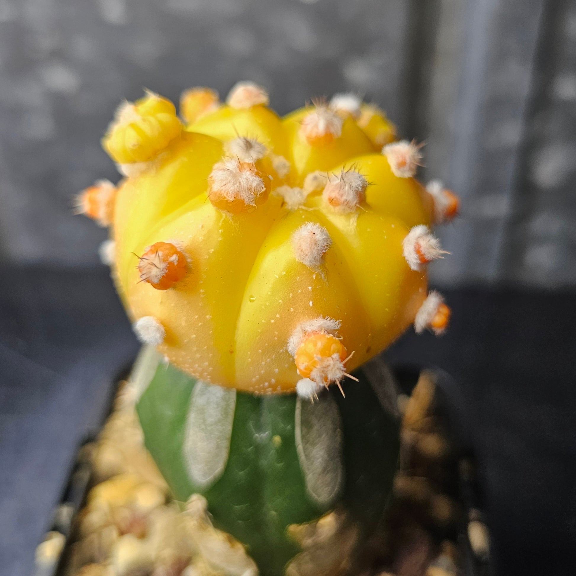 Astrophytum asterias hybrid with an all-over vibrant yellow glow touched by soft peach tones. Multi-headed and full of presence — a bright, uplifting addition to any collection.