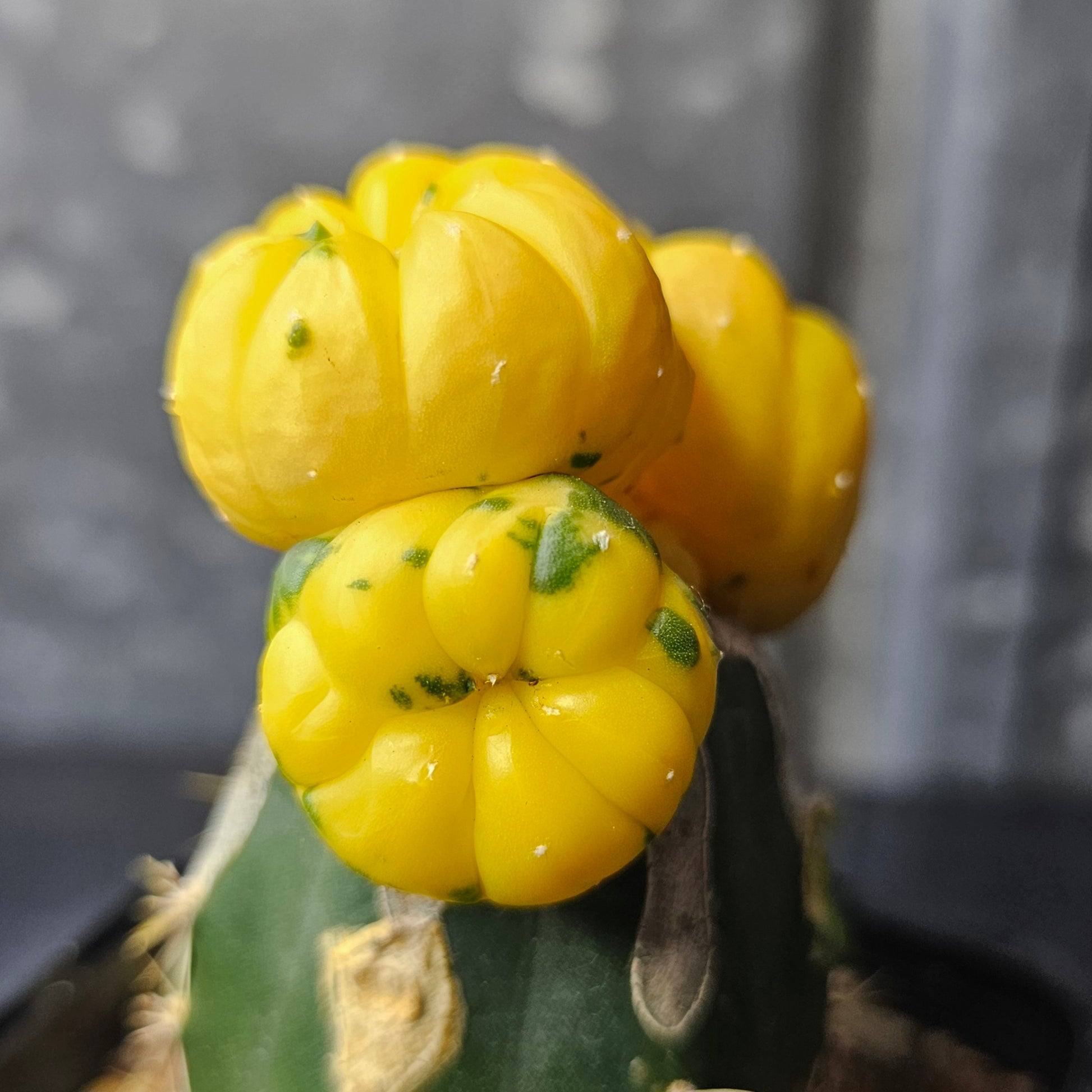 Astrophytum asterias hybrid (3 head) — ultra vibrant yellow with a tasteful dusting of green speckles. Three distinct heads for collectors who dare to be different.