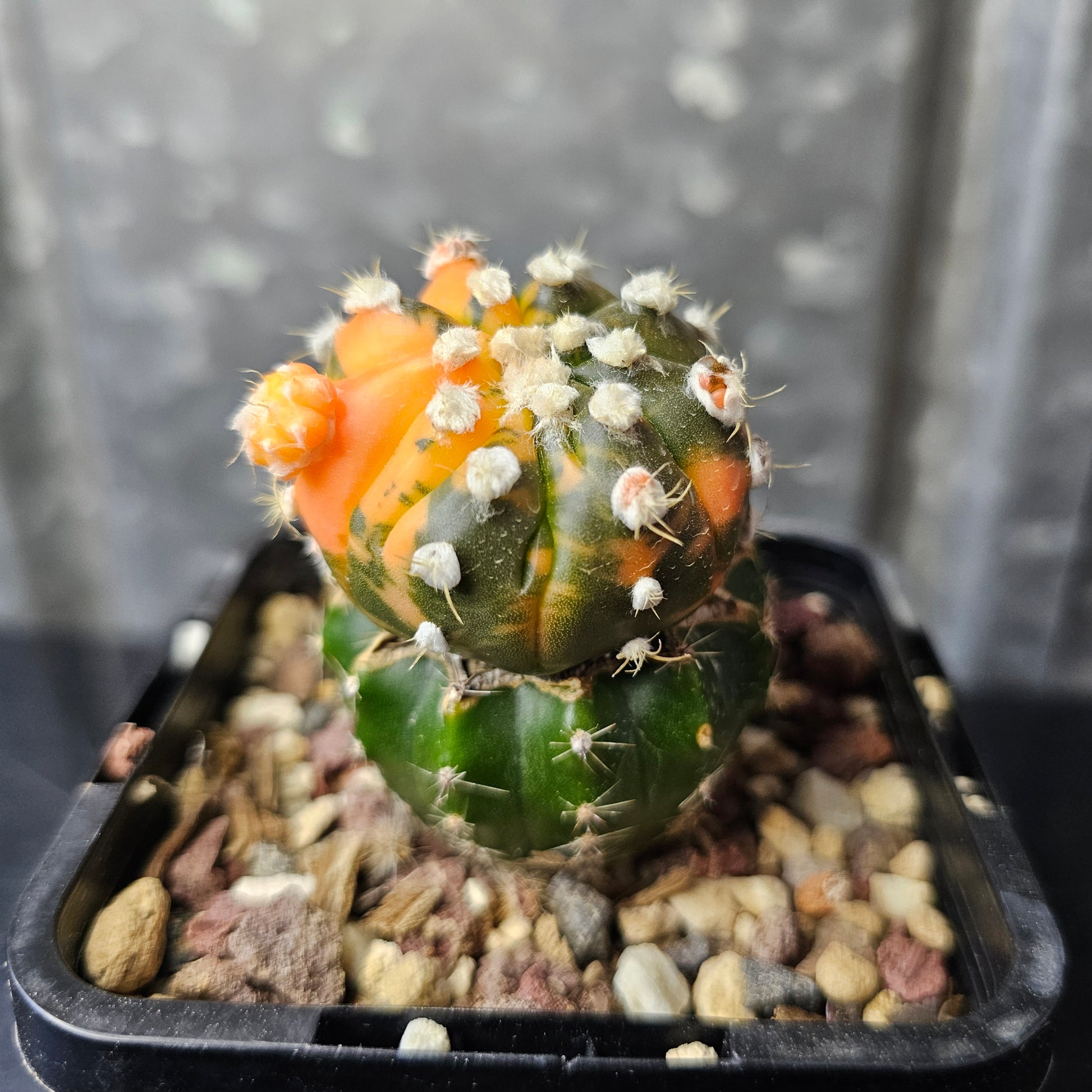 Astrophytum asterias multi head specimen showing multi-colour variegation on short stock. New heads already coming through, adding to its unique appeal.