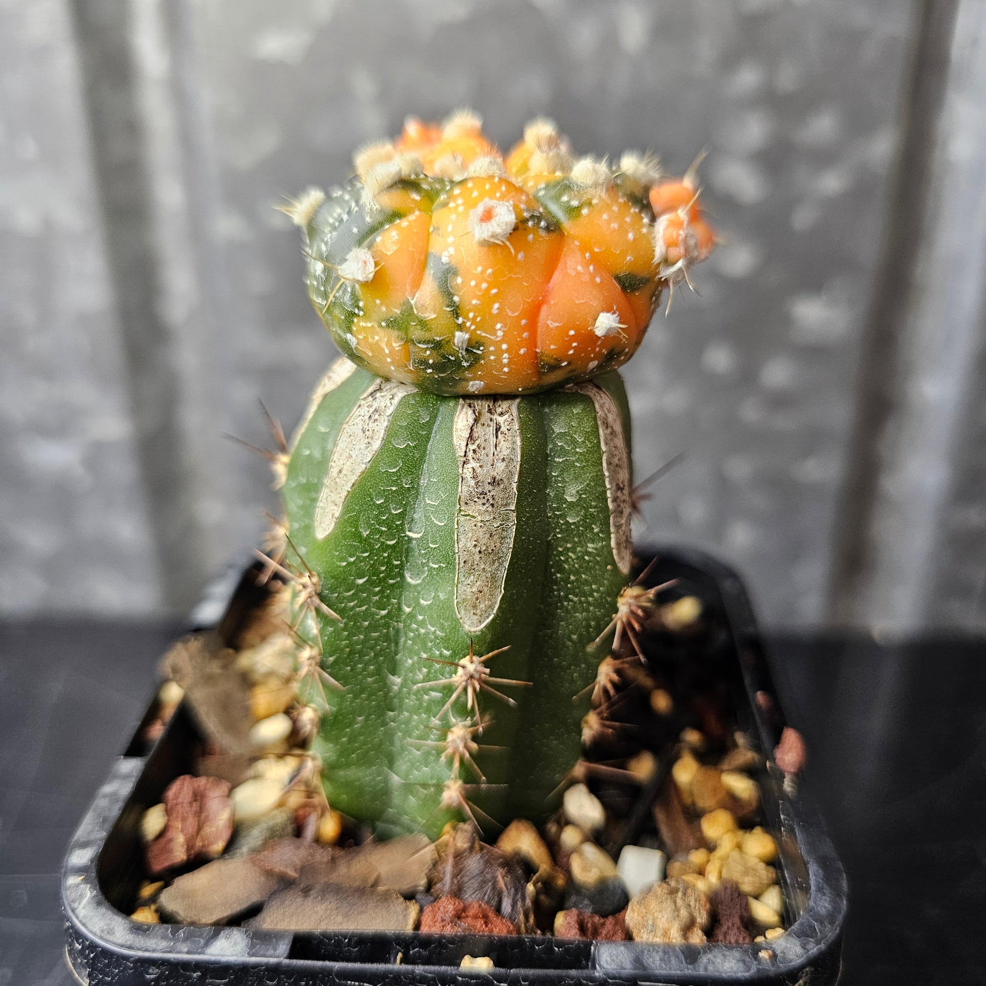 Astrophytum asterias variegated hybrid with vibrant orange body and crisp green markings. New heads are emerging, making this a dynamic plant to watch as it develops.