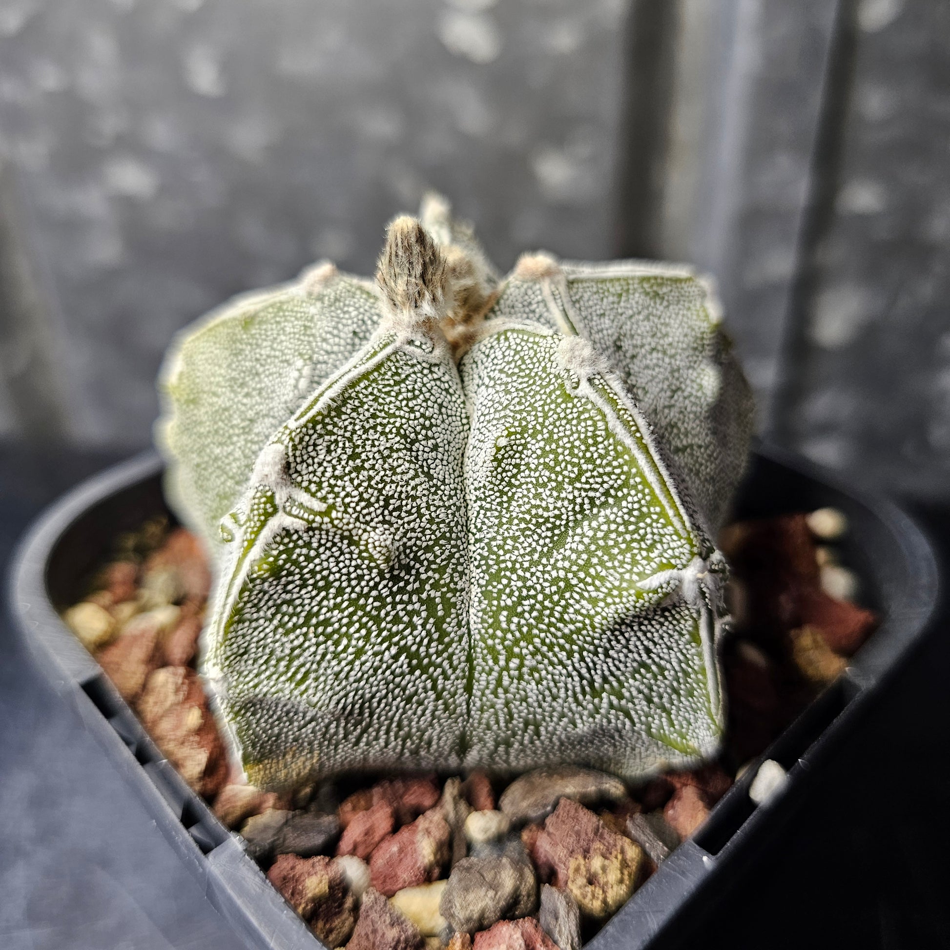 Astrophytum myriostigma hybrid with dense, snowy flecking, sharp rib definition and a beautifully structured crown. A clean, frosted look with that unmistakable hybrid character.