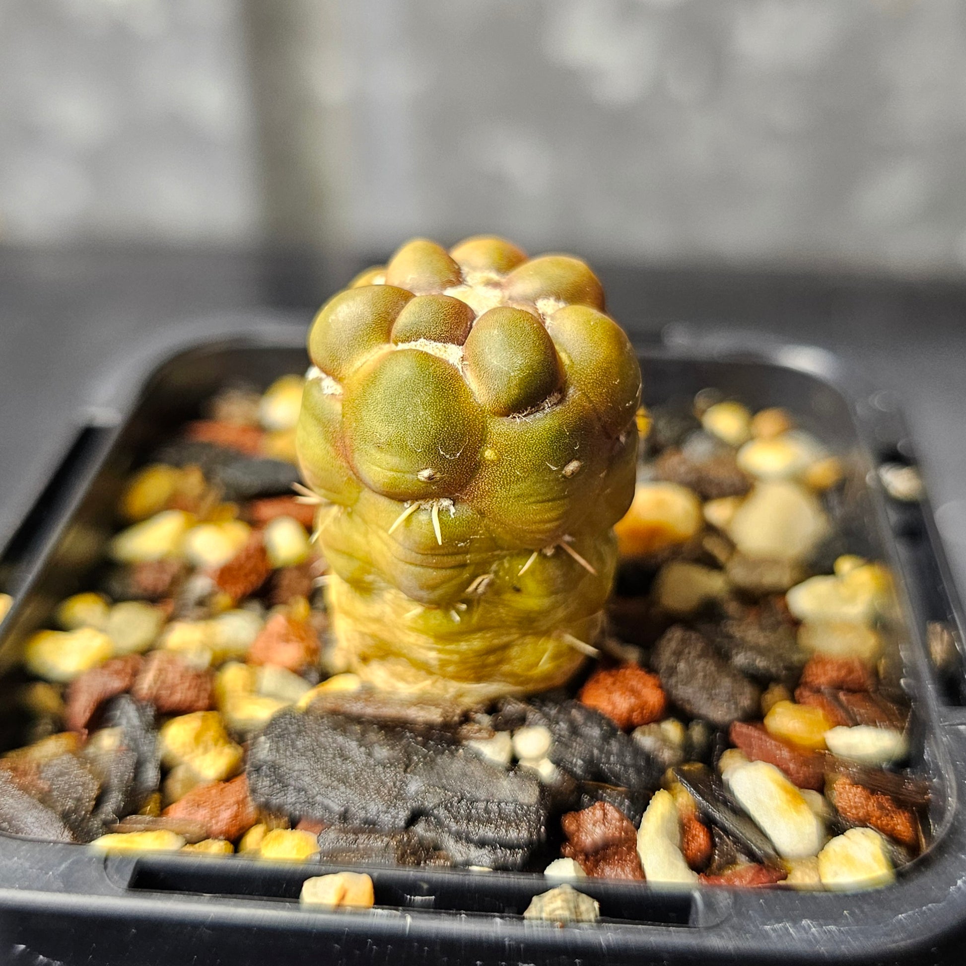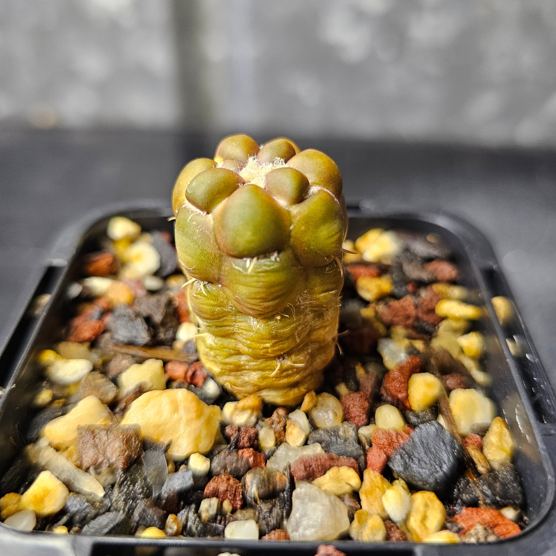 Cintia knizei is a compact Bolivian species with a rounded olive-green body and soft, woolly areoles. It stays small and sculptural, producing bright yellow flowers that seem oversized for its size. A rare and rewarding miniature with undeniable charm.