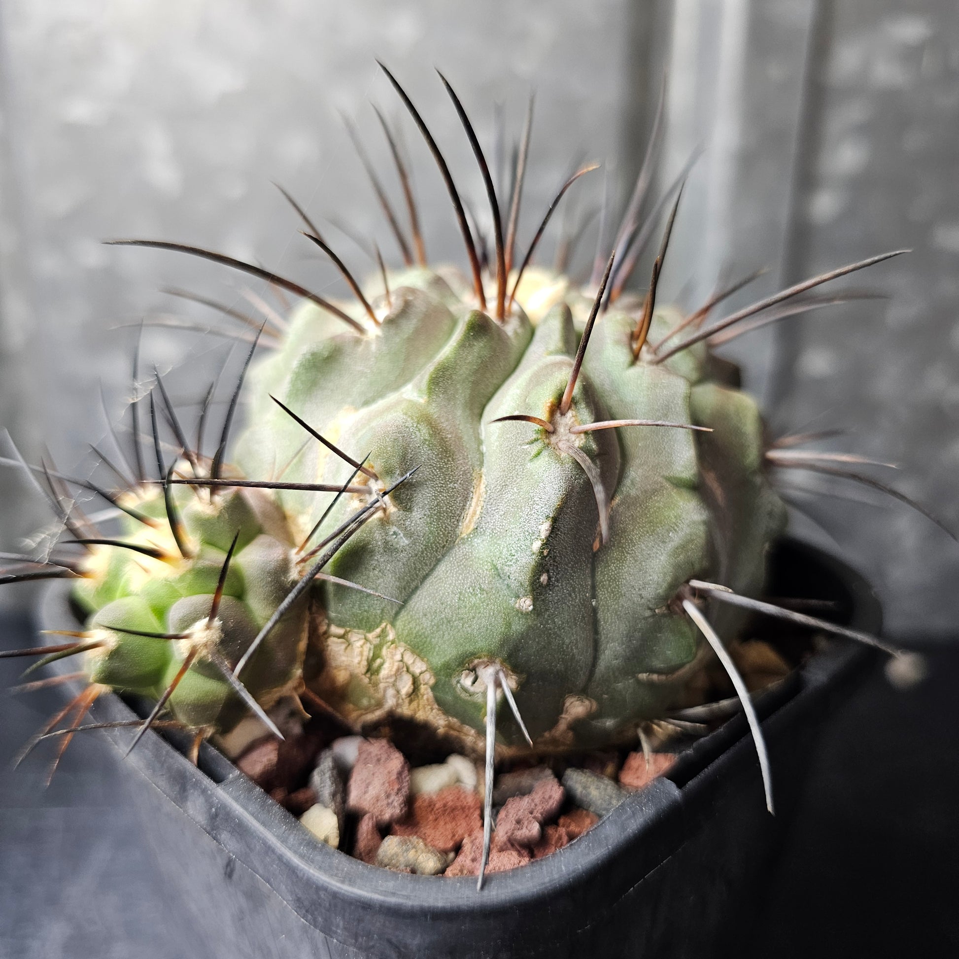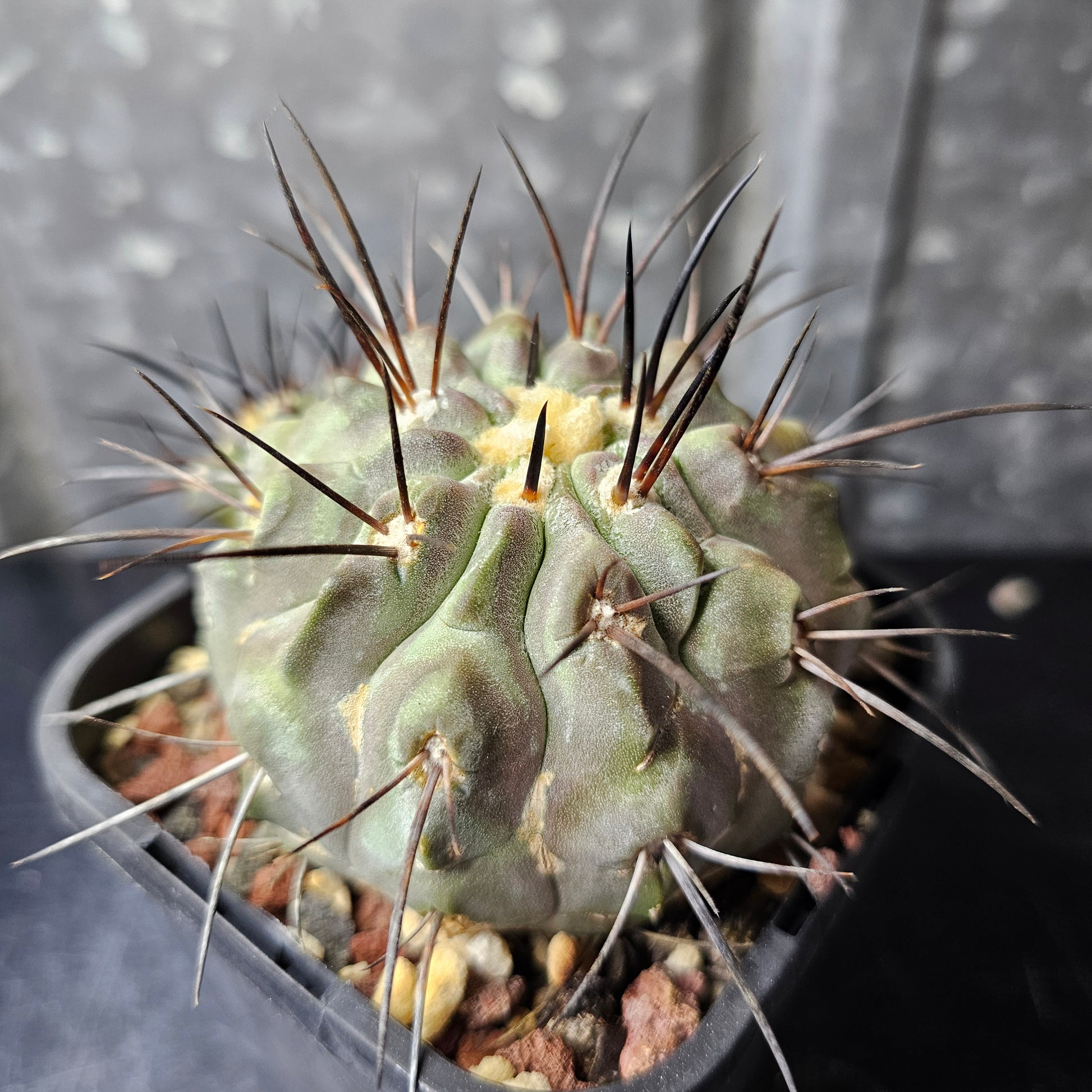 A truly exceptional Copiapoa dealbata of very large specimen size, already forming a pup and commanding immediate presence. The body shows an icy blue-green to frosted green finish, contrasted by the unmistakable dealbata spination. Fresh growth pushes jet-black spines that harden and sculpt the plant into a dramatic, architectural form. Intensely characterful, highly sculptural and exceptionally rare at this size. This is our most requested line of all time and availability is always extremely limited.