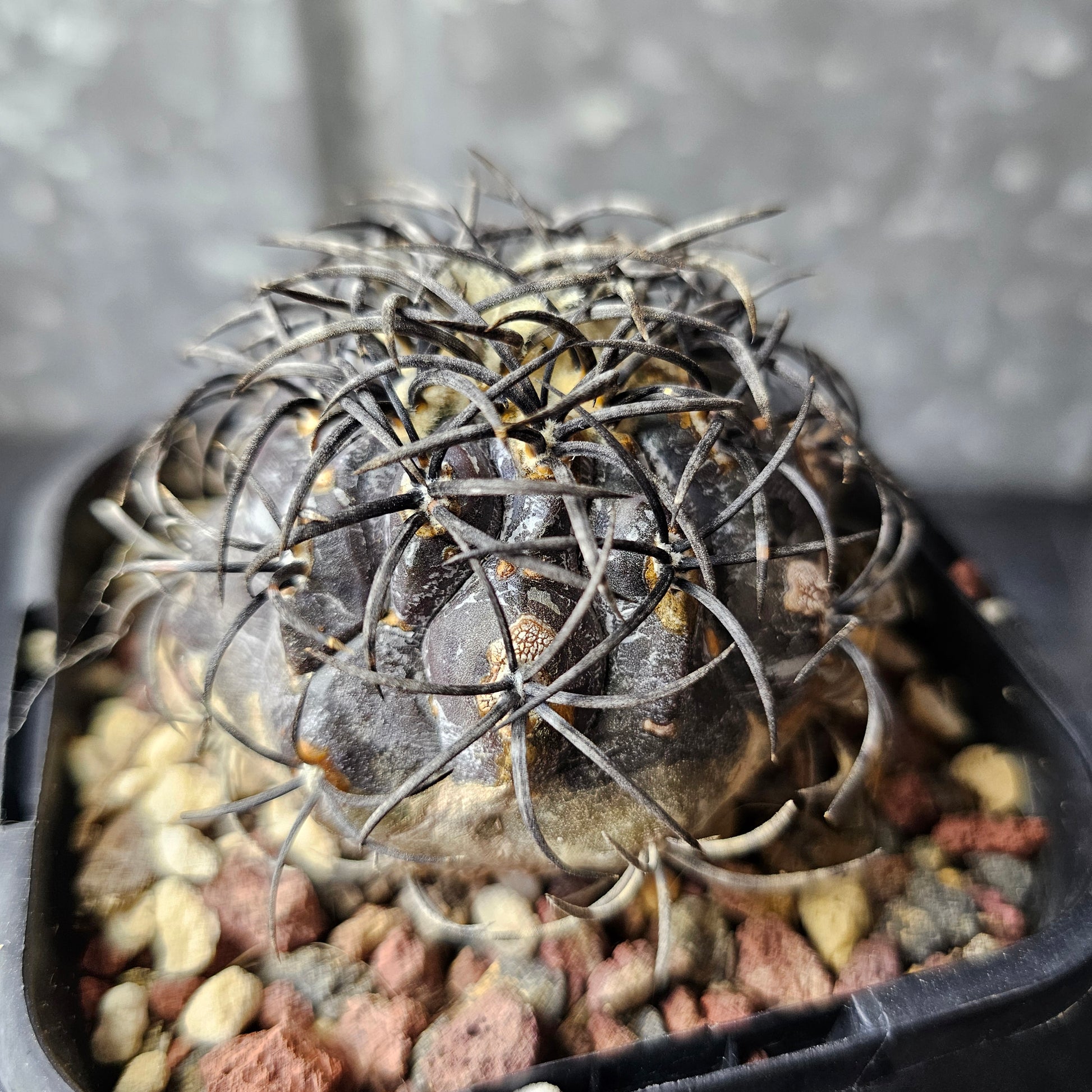 Nearly impossible to find — and even harder to secure at this calibre. This species carries an ultra-dark, shadowed body wrapped in dense jet-black spines, creating one of the most dramatic contrasts in the entire Copiapoa world.