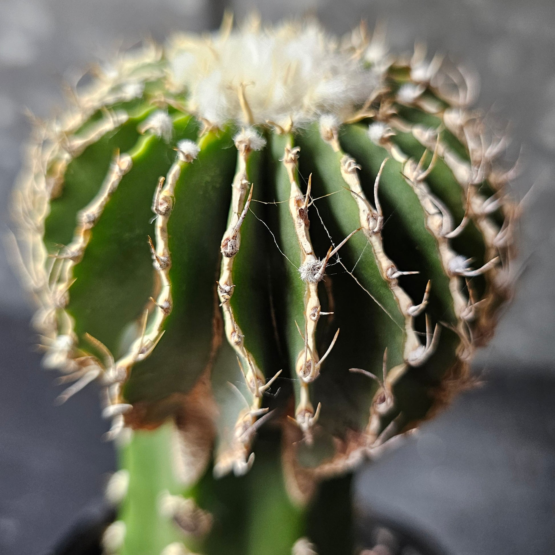 A rare treat and a must-have for any serious collection. This is a large, flowering Geohintonia mexicana with deep green colour, tight rib structure, and the natural weathering and patina expected with age in this species.