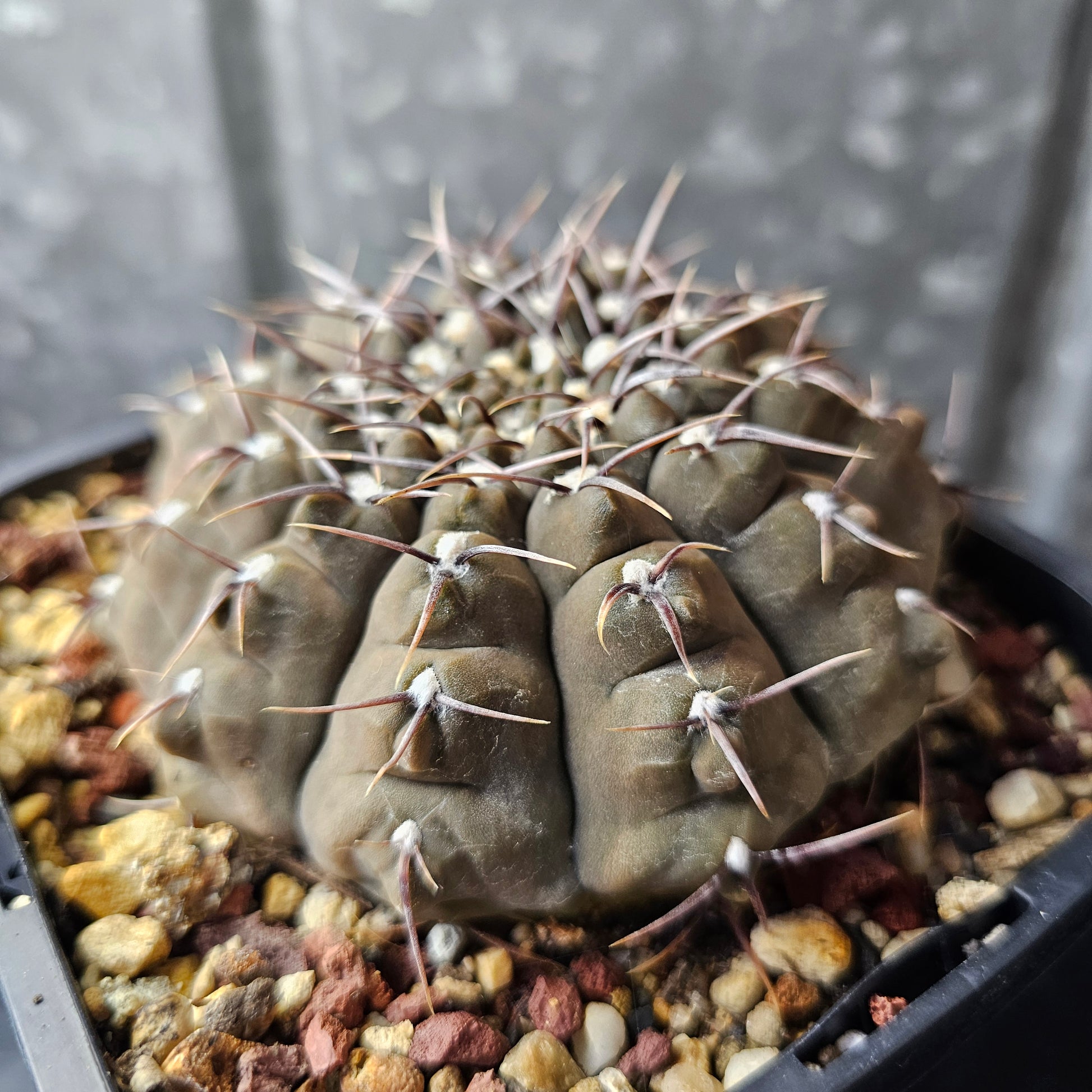 Gymnocalycium riojense with a deep coloured body, short spines and textured skin. A large, slow-grown specimen that carries weight and character beyond its size.