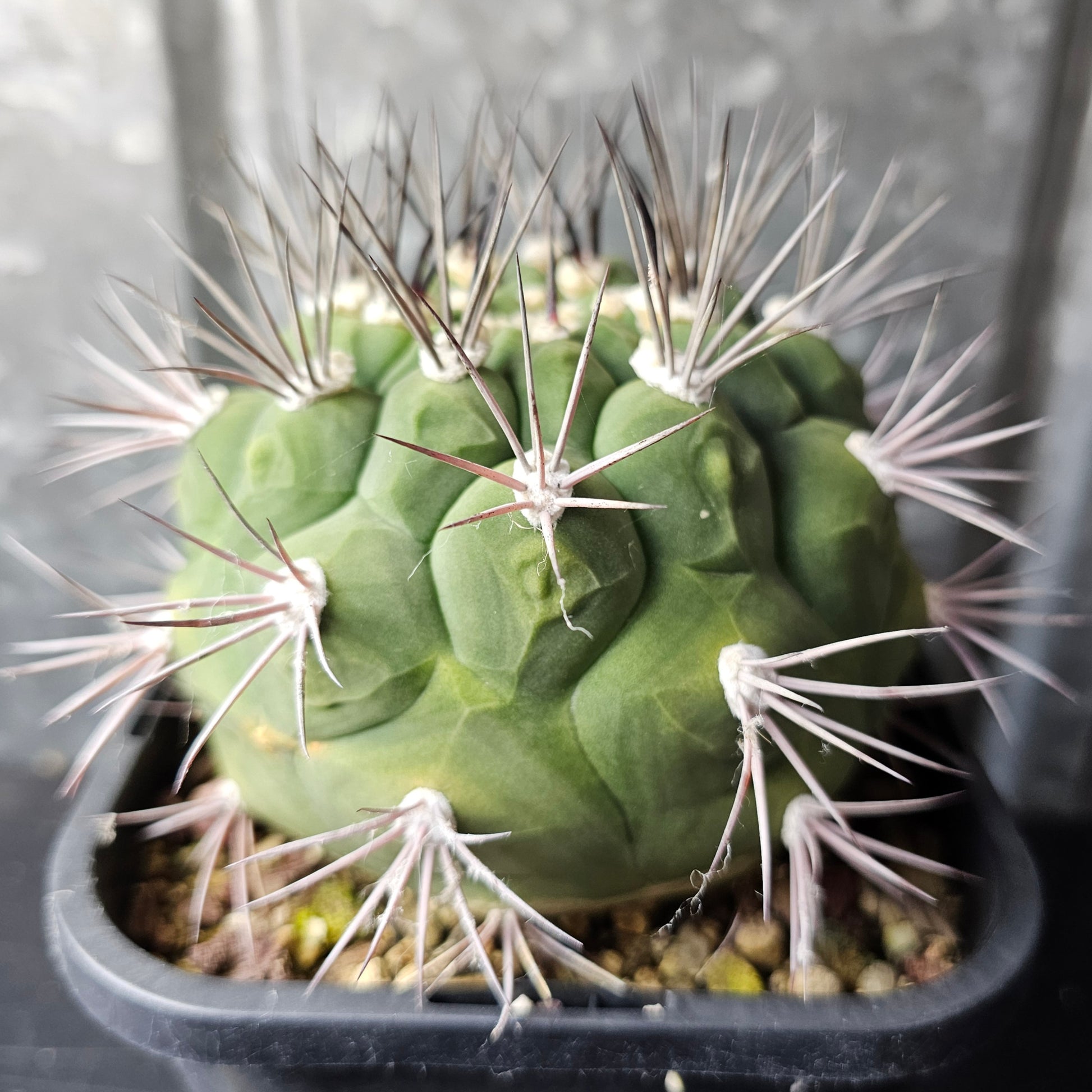 An impressive Gymnocalycium saglionis v. tucumanensis with over a decade of growth behind it. Its hypnotic green, textured skin and bold, geometric spines command instant presence. A stoic, sculptural plant that brings real provenance and weight to any serious collection.