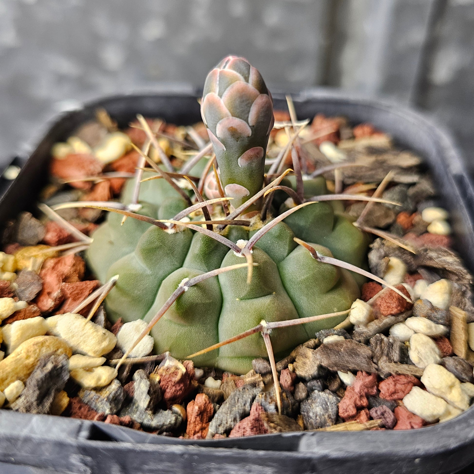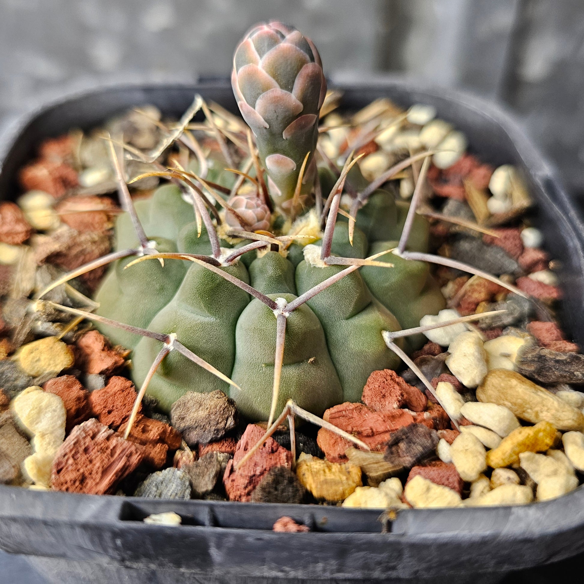 A character-rich Gymnocalycium vatteri with a heavily notched body and distinctive spines that emerge in sets of three. The frosty slate-green colouring and slow-grown nature give this plant a dense, well-earned presence and strong structural appeal.