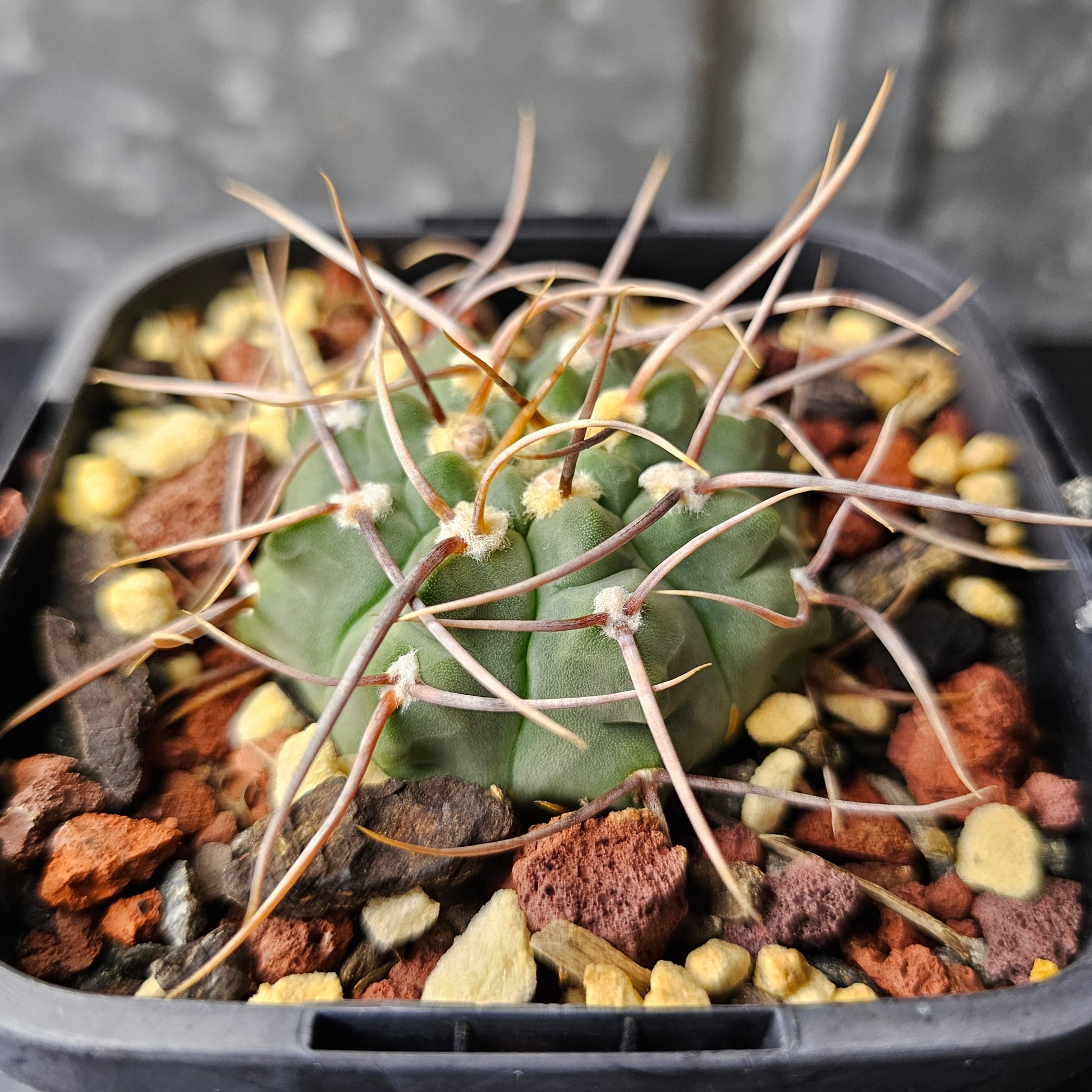 A distinctive spine-selected form of the classic Gymnocalycium vatteri. This specimen features longer, more unpredictable spination over a flattened body, finished in a frosty blue-green tone. A familiar species presented with added edge and individuality.