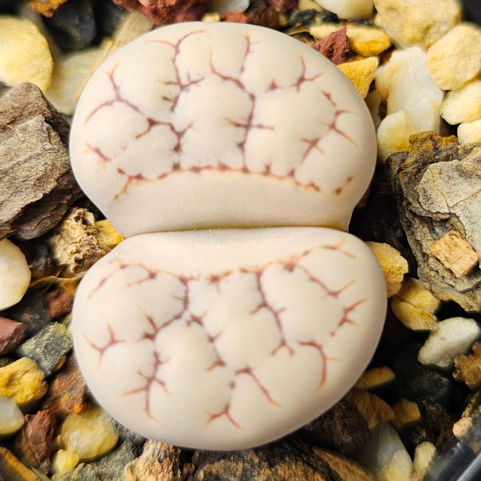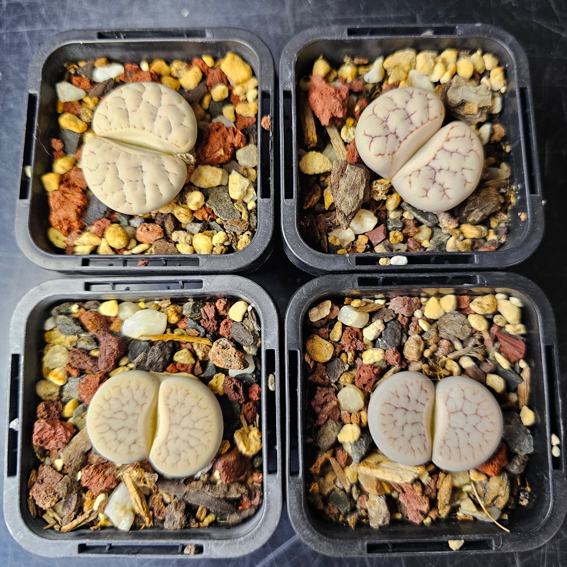 A curated bundle of four pale, neutral-toned Lithops featuring soft whites, creams and light greys with subtle patterning. Calm, understated and highly collectable.