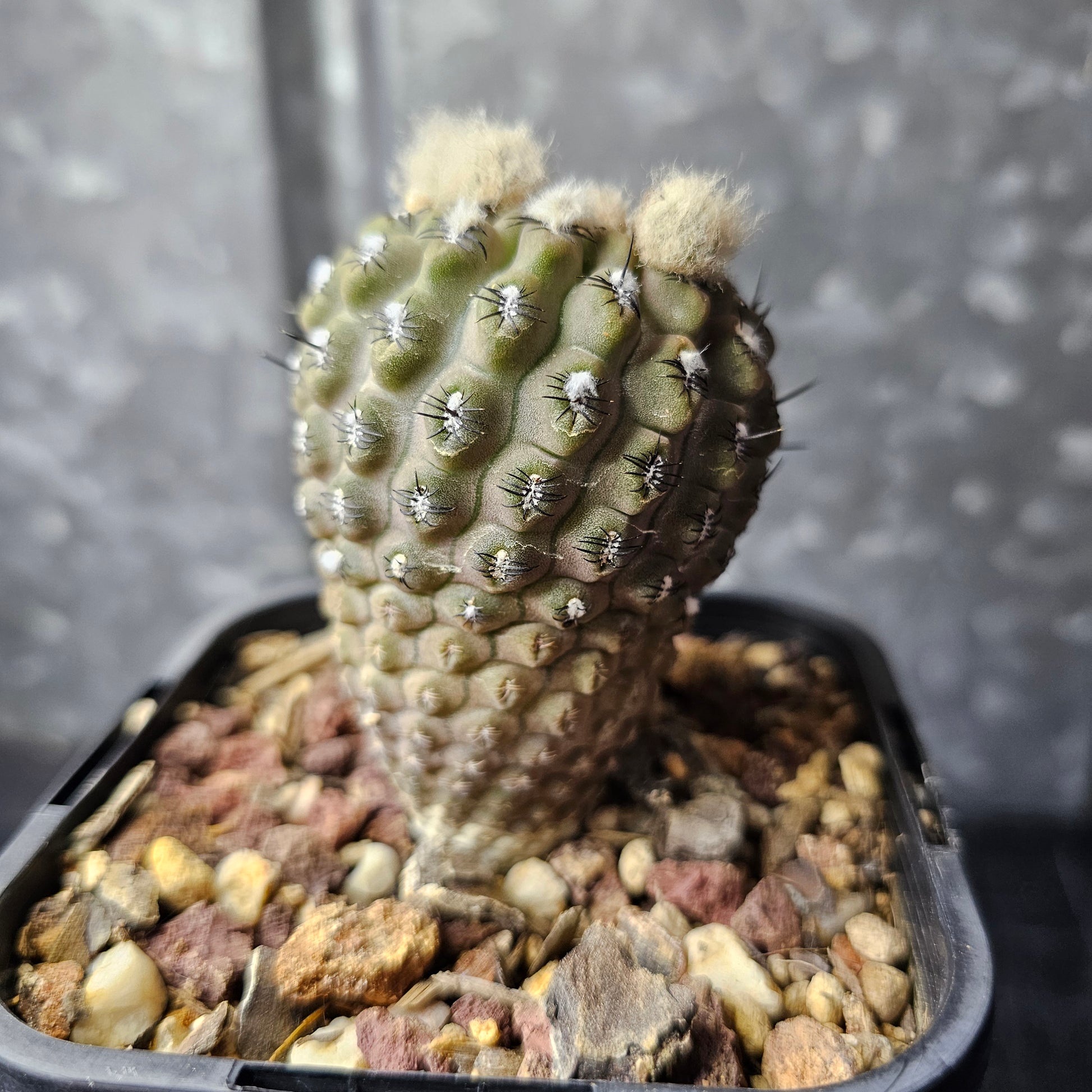Neoporteria reichii - a true relic-grade specimen, slow grown in full mineral for exceptional hardness and character. This plant shows a frosty olive-green to grey body with short, dark, tightly set spines that emphasise its rugged, old-world look. Rarely offered at this size and quality.